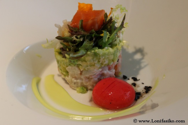 Las sensaciones gastronómicas son ya muy buenas, desde el principio, tanto en la atención como en la cocina. El siguiente plato lo compone un taco de salmón ahumado y cola de langostino marinada con bombón liquido de gazpacho-cereza y brotes frescos. El título del plato es largo y difícil de pronunciar de carrerilla, aunque viendo lo limpio que deja el plato Miguel, se puede deducir que estaba muy rico. Llama la atención el bombón de gazpacho, un esferificación con un sabor muy logrado, la calidad del pequeño pero delicioso taco de salmón ahumado, y la ensalada de langostino con aguacate.