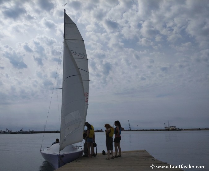 Subimos cinco personas al barco de vela con el que surcaremos las aguas de la bahía de Alfacs. Nos cuenta Alfred que estamos navegando en un barco de carreras, de competición. A bordo, nos explica los detalles básicos del barco: cómo funcionan las velas, los amarres, cómo manejar el timón en base a los vientos que azotan la zona, etc.