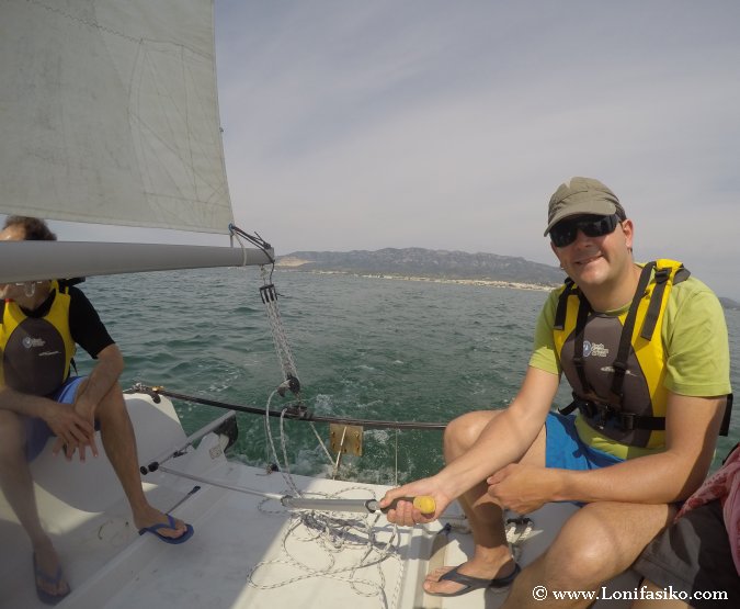Qué gozada ver el rápido fluir de este elegante y rápido velero sobre las aguas de la bahía. Y qué rápido obedece a las contradictorias directrices de los torpes grumetes, que a turnos, ejercen de aprendices de capitán.