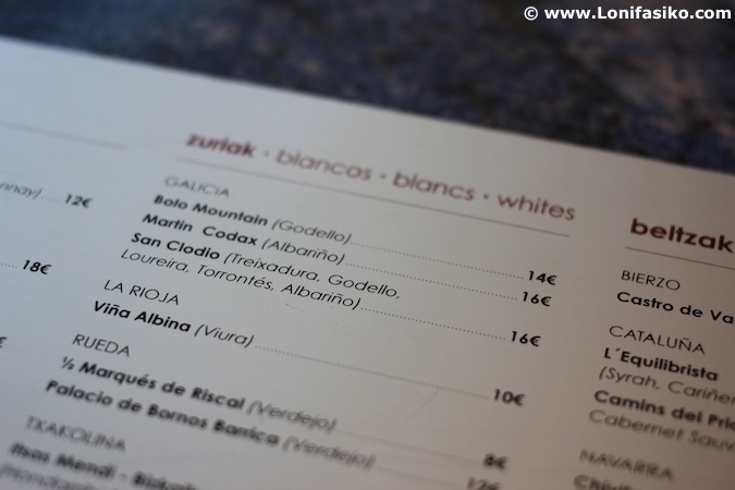 Echamos un vistazo a la original carta, impresa en un tablón metalizado. Sin querer, por deformación gastronómica, la vista se nos va hacia la carta de vinos y hacia las fórmulas de menús que propone este restaurante del centro de Bilbao.
