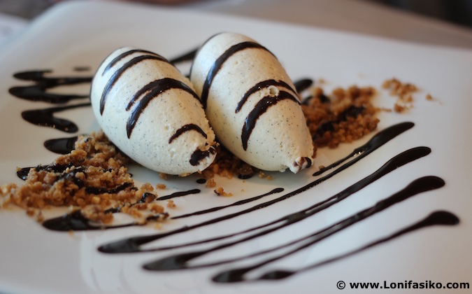Laura estaba expectante con el postre. Yo admito que tenía miedo. Crucificadme, pero no me gustan las torrijas ni la Semana Santa; especialmente aquellas que están demasiado empapadas en leche y adquieren un peso considerable; no sé, la leche, la textura… ¿Por qué tengo que justificarme tanto? ¡Parezco un mártir! Sin embargo, soy muy agradecido en la mesa, y pruebo la torrija, un postre que en palabras literales del personal del restaurante “no pueden quitar de la carta ni aunque lo intenten“. La torrija caramelizada en sartén con helado, de queso, se ha convertido es una especie de postre abanderado de este restaurante del Guggenheim Bilbao.