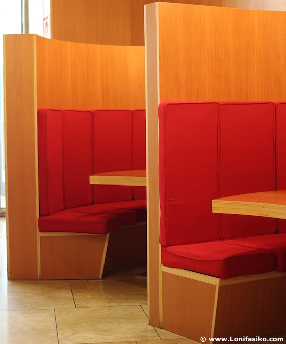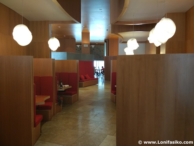 A izquierda y derecha del pasillo, vas dejando pequeños comedores semi-privados en forma de ‘u’, acabados en agradables tonos de madera. Es una informal y original forma de separar espacios y conversaciones.