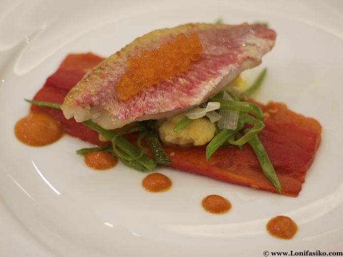 En el menú degustación expresamente elaborado para la ocasión, comenzamos destacando ‘el langostino que quiso ser jamón’, un divertido pincho de langostino servido como si fuera una pata de jamón, en un jamonero; un delicioso bocado a base de un langostino a la gabardina con un ligero toque de queso de cabra y mermelada de oloroso. Esto es un ejemplo de entrante sencillo al que se le da un guiño actual y divertido para sorprender al comensal.