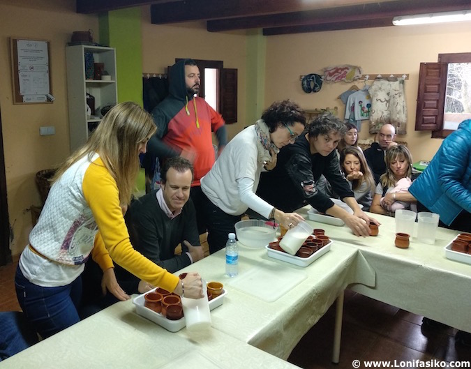 Conocido el origen de ese sabor característico a piedra quemada que suelen tener las cuajadas más tradicionales y auténticas, volvemos al método de la ‘cuajada express’ para verter la leche, ya fría después de dos esguinces de muñeca y tres cambios de mano, en los recipientes destinados a las cuajadas individuales, que ya contienen las gotas mágicas de cuajo.
