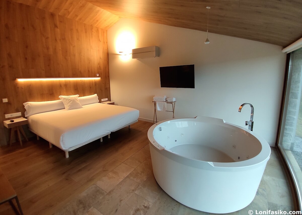 Puedes llevar buenas viandas y vino navarro desde casa, o pedir comida, vino y champán al propio hotel Palacio de Yrisarri, que te suben el pedido en un periquete. Algunas cabañas tienen jacuzzi y se prestan claramente a la lujuria -y al postureo-. Yo no digo más. La película, que se la monte cada uno.