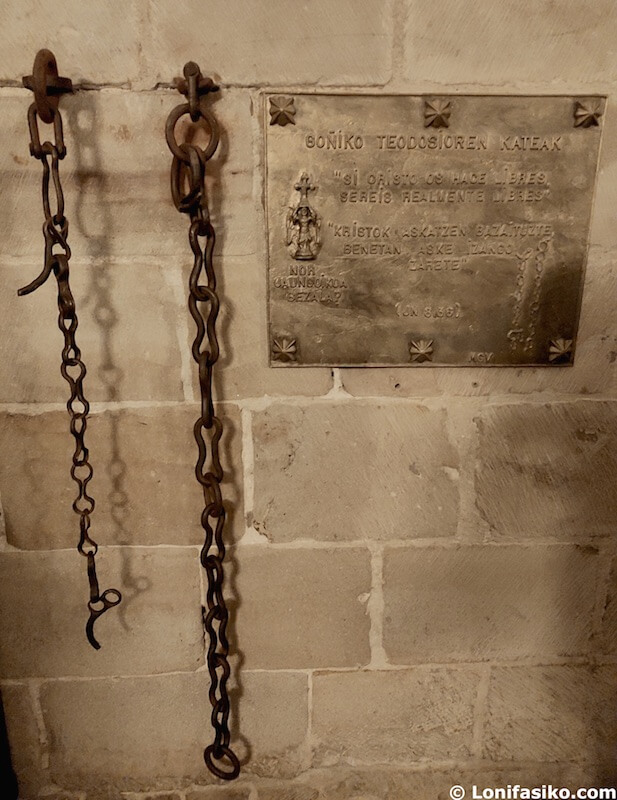 Junto a la entrada de la antigua capilla descansan las cadenas de Teodosio de Goñi, desafortunado caballero, penitente y fundador, según la leyenda, de lo que a la postre se convirtió en un santuario de alta montaña.