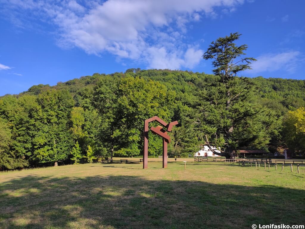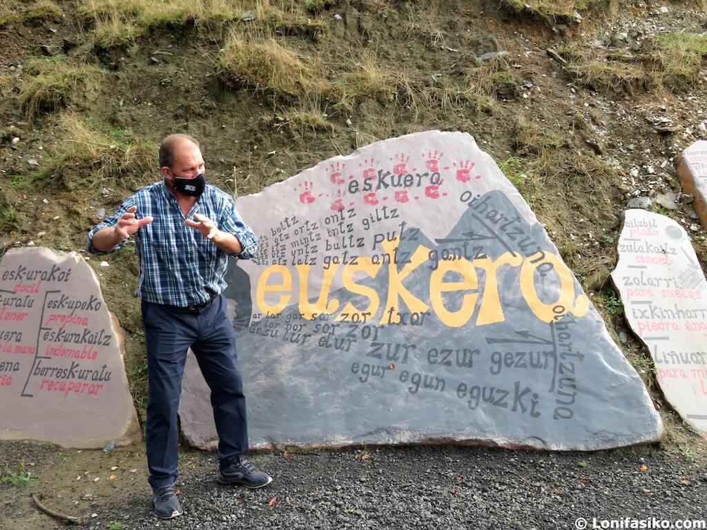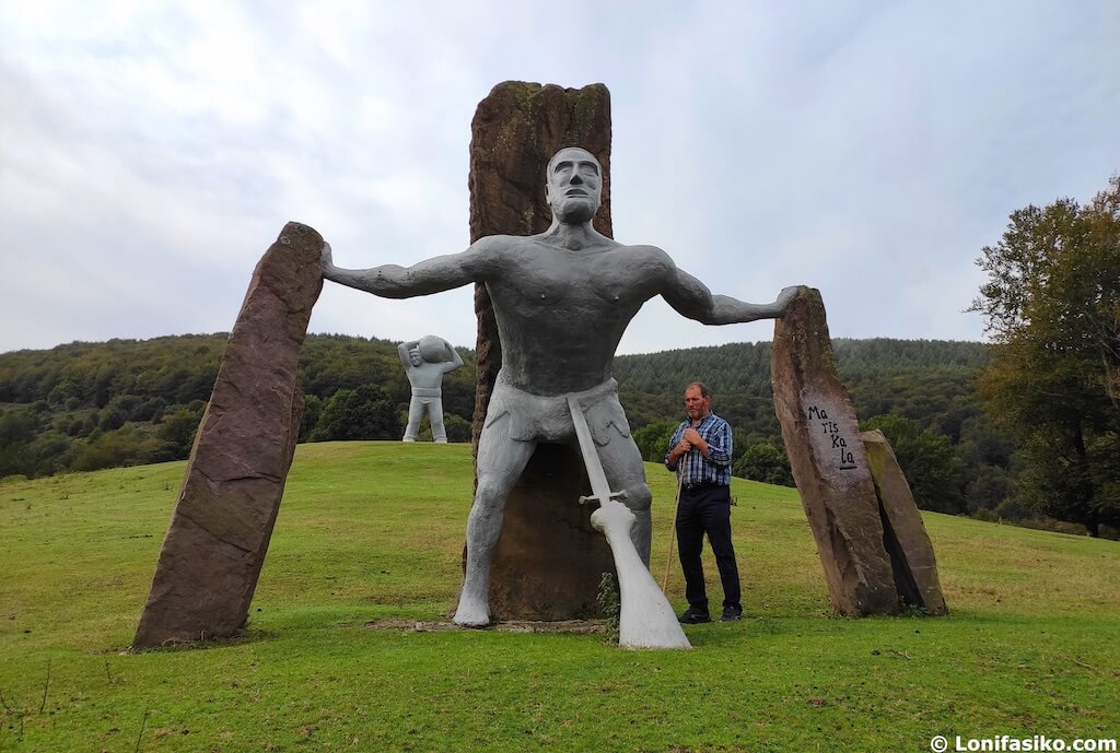 Por si esto fuera poco, en el precioso terreno aledaño al caserío expone esculturas de enormes dimensiones (¡realizadas por él!) y aprovecha las piedras del lugar para plasmas en ellas poemas y pensamientos, dibujar seres mitológicos y buscar el sentido a las raíces del euskera.